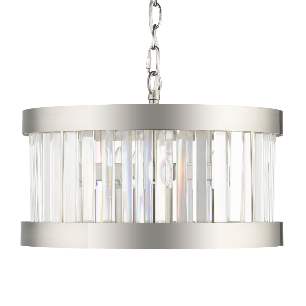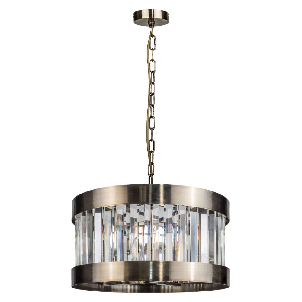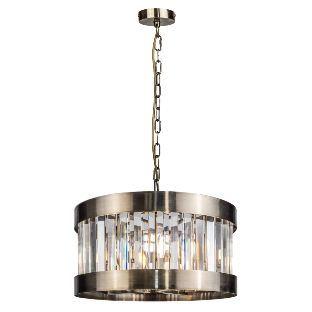 The Pandora 3 Light in Antique Brass is a statement ceiling light comprising of sparkling crystal bars encased in two thick antique brass bands. The elegant band of crystal reflects the light beautifully when illuminated for a glamorous lighting effect. The Pandora is fully LED Compatible and available in a number of sizes, a matching wall light and in Satin Chrome.