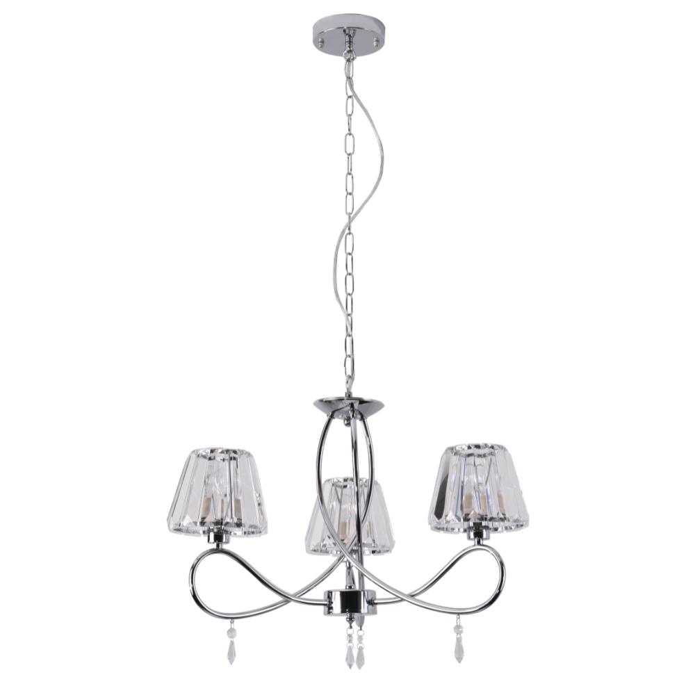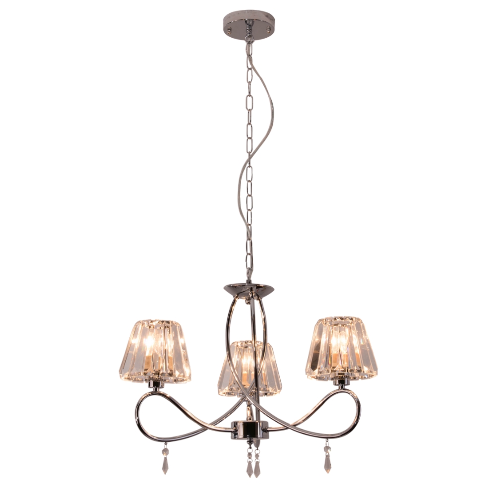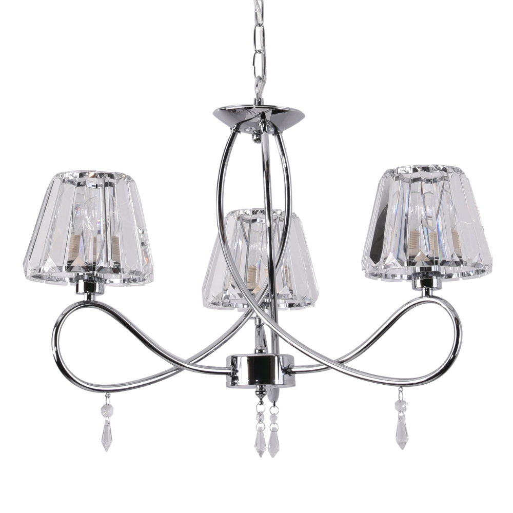 The Senza 3 Light Ceiling fitting is finished in Polished Chrome and features decorative crystal glass shades which create a beautiful sparkling effect when illuminated. Each curved arm of the Senza is adorned with a delicate crystal droplet. The Senza range also comes in a 5 Light version, single pendant, Wall Light, Table Lamp and an Antique Brass finish.