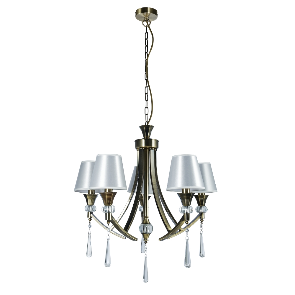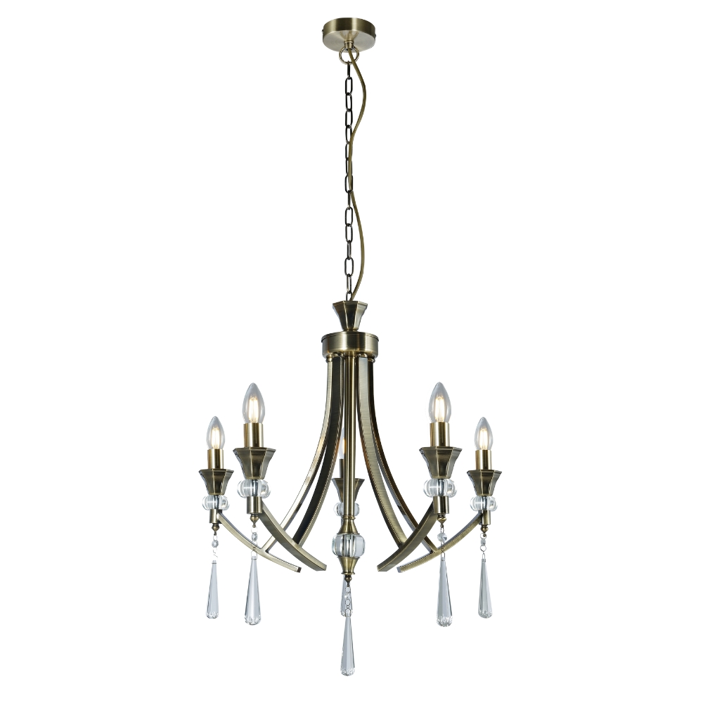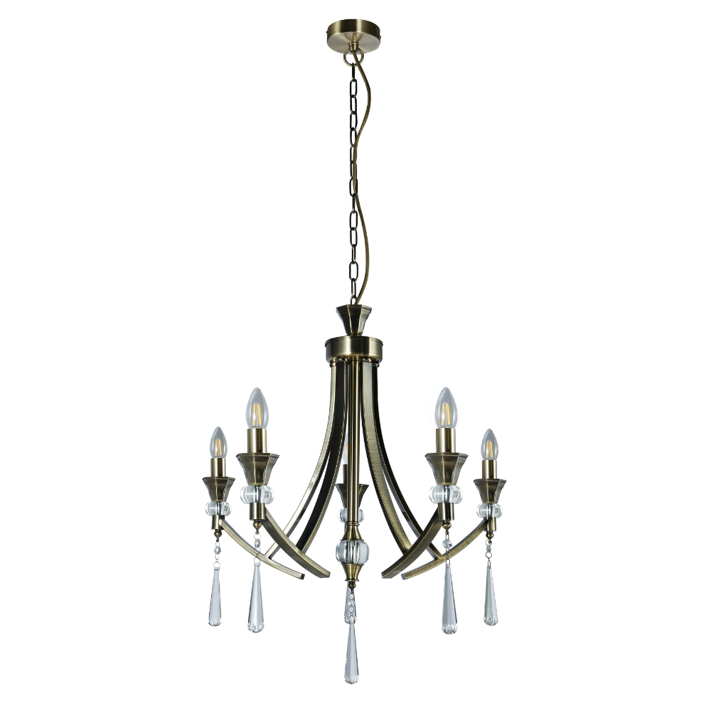 This Sophia 5 Light Multi-arm Crystal Ceiling Pendant Light comes in Antique Brass. This fitting would make a Stunning addition to any Living Space. Each arm of the Sophia is adorned with a Crystal Sconce and Droplet and has a decorative crystal ball of the centre stem. It can be used with or without shades. The Height is adjustable before installation; Extra Chain will need to be ordered if necessary. This Sophia 5 Light is also available in Polished Chrome.