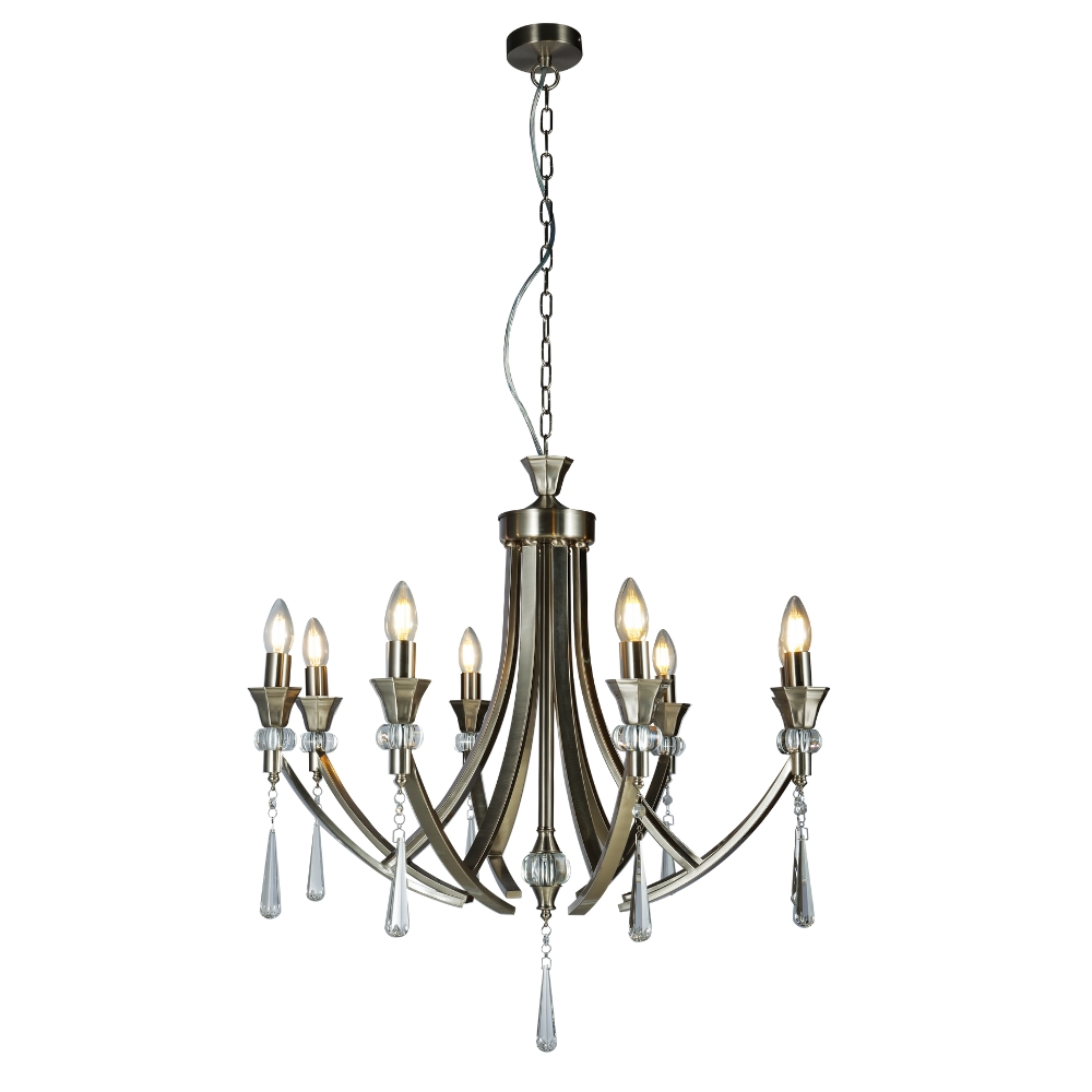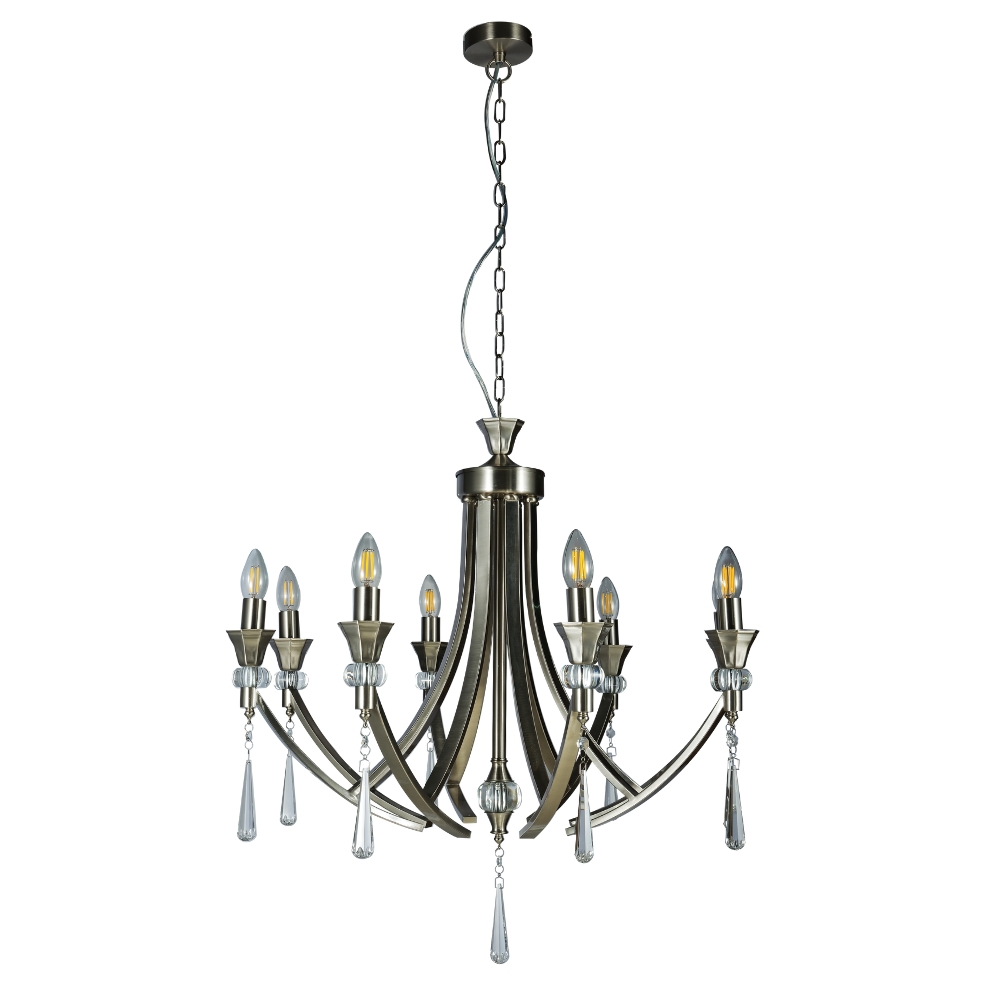 This Sophia 8 Light Multi-arm Crystal Ceiling Pendant Light comes in Satin Chrome. This fitting would make a Stunning addition to any Living Space. Each arm of the Sophia is adorned with a Crystal Sconce and Droplet and has a decorative crystal ball of the centre stem. It can be used with or without shades. The Height is adjustable before installation; Extra Chain will need to be ordered if necessary.